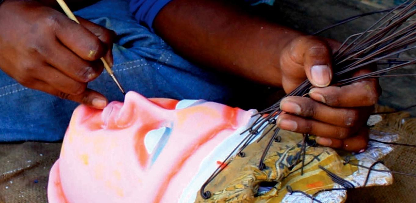 Manbhum Chhau – Manbhum Chhau, also known as Purulia Chhau in West Bengal, features large masks, vibrant costumes, and high-energy acrobatics that depict episodes from the Ramayana, Mahabharata, and local legends. With expressions carried through dynamic movement, it remains a bold living heritage. The magnificent masks of Manbhum Chhau, crafted by artists of Charida village, bring each character—gods, demons, heroes—to life. This 150-year-old craft tradition, which began under the patronage of King Madan Mohan Singh Deo of Baghmundi, continues today, blending devotion, artistry, and identity.