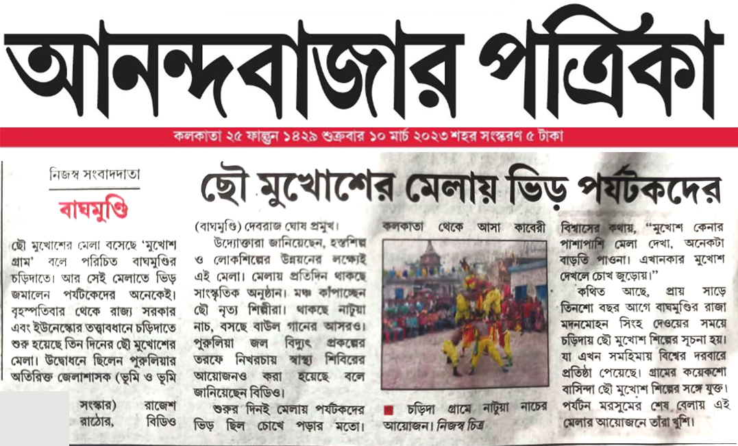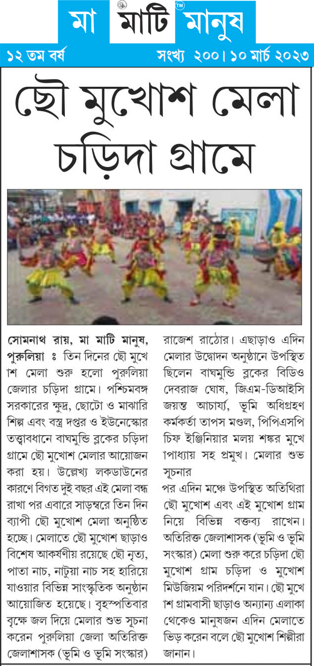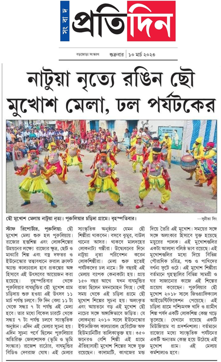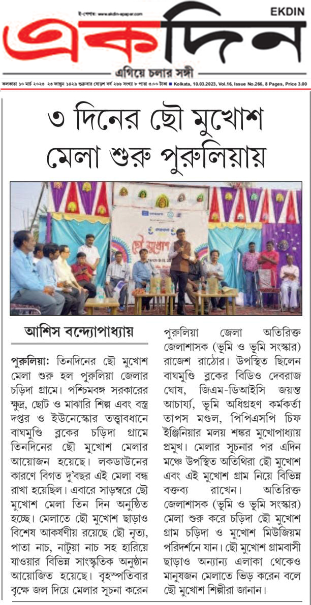 Chhau Mask Festival was held at Charida, Bagmundi, Purulia on Mar 9-11, 2023 from 11 am to 7 pm to celebrate the Intangible Cultural Heritage (ICH) of Chhau Mask. The festival was part of the collaborative initiative, Rural Craft and Cultural Hub (RCCH), undertaken by the Department of MSME&T, Govt. of West Bengal in association with UNESCO to strengthen ICH based practices of the state and promote the grass-root creative entrepreneurs.